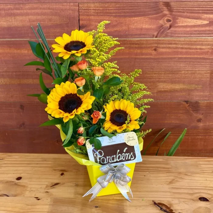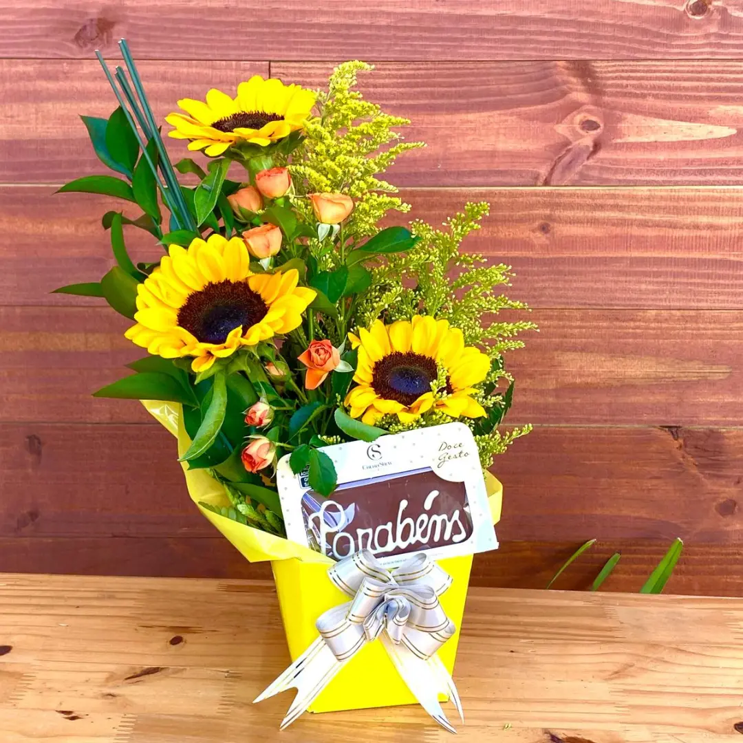 Celebre momentos especiais com um presente encantador! Este arranjo combina três girassóis vibrantes, símbolo de felicidade e energia, com uma barra de chocolate Cacau Show Parabéns, criando um presente perfeito para aniversários e conquistas. É uma forma simples e carinhosa de transmitir seus votos de felicidade e alegria.