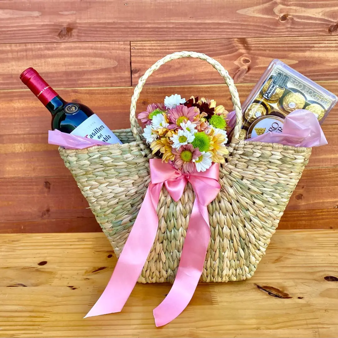 Surpreenda com uma combinação irresistível de charme e sabor. Nossa Bolsa de Presente Sofia traz um toque rústico e elegante, preenchida com um vinho selecionado para momentos especiais, uma caixa de bombons Ferrero Rocher e um delicado arranjo de flores do campo, que adiciona cor e frescor à experiência. Ideal para presentes em aniversários, datas especiais ou para aquele gesto carinhoso que faz a diferença. Cada detalhe foi pensado para encantar e transformar qualquer ocasião em uma celebração memorável!