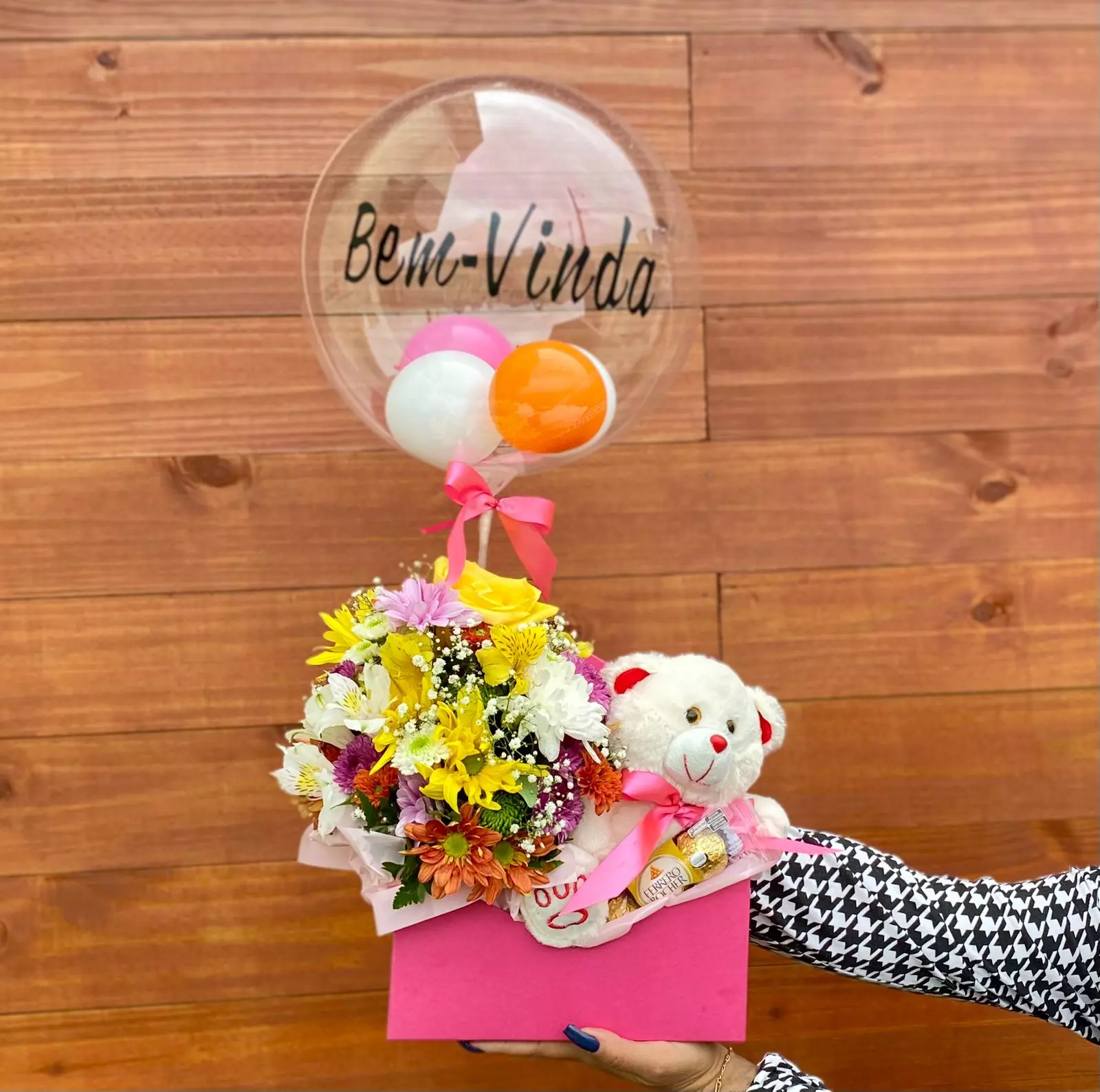 - Um balão bubble com a mensagem “Bem-vindo”, perfeito para celebrar a chegada do bebê.