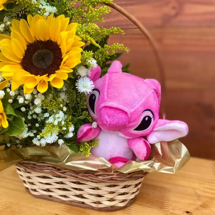 Encante com um presente único: nossa cesta com 3 girassóis e pelúcia da Angel! Os girassóis, símbolos de felicidade e energia, são combinados com um adorável urso de pelúcia, perfeito para transmitir carinho e alegria. Essa cesta é ideal para fãs de personagens cativantes e para quem deseja tornar momentos especiais ainda mais inesquecíveis.