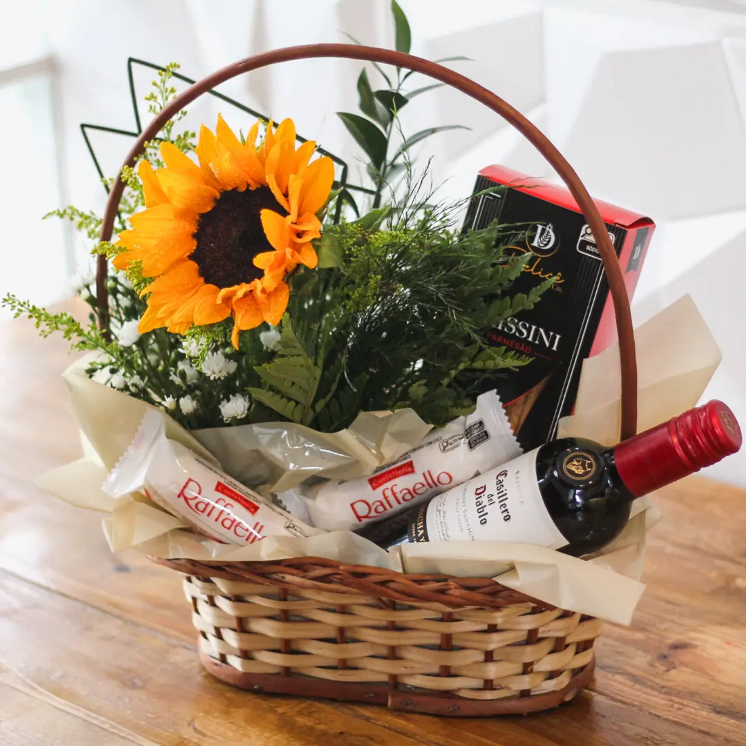 Leve sofisticação e alegria a quem você ama com a nossa Cesta de Presente Girassol, um toque de brilho e positividade, acompanhada de um vinho selecionado e petiscos deliciosos. Perfeita para aniversários, comemorações ou qualquer ocasião que mereça um presente marcante e refinado.